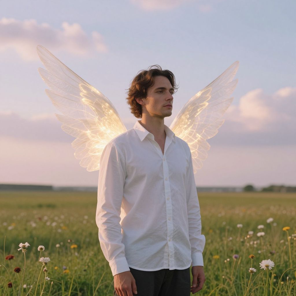 A man with brown hair stands in a serene, sunlit meadow, wearing a white button-up shirt with delicate, ethereal wings extending from his back. The wings shimmer slightly, glowing with a soft golden light, as if made of moonlight and air. He has a calm, confident expression, eyes gazing gently toward the horizon. The background features a blend of green grass, blooming flowers, and a distant sky filled with soft pastel clouds. The overall atmosphere is peaceful, magical, and slightly dreamlike.