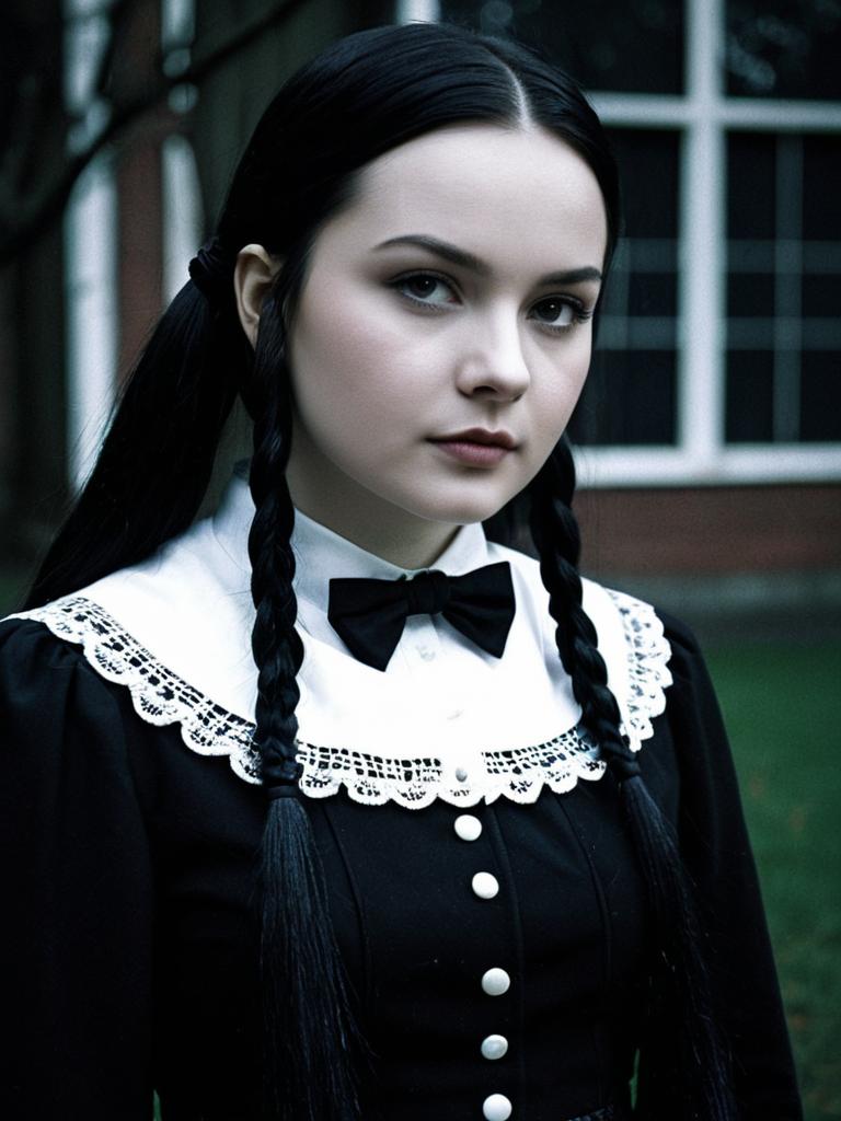 Woman in Wednesday Addams Costume, photorealistic gothic cosplay portrait, cinematic realism