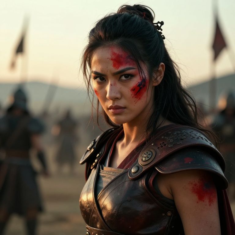 "braveheart costume female, 1girl, braid, long hair, looking at viewer, belt, solo, gloves, black hair, closed mouth, single braid, weapon Realistic photo of casual sexy person with pretty face"