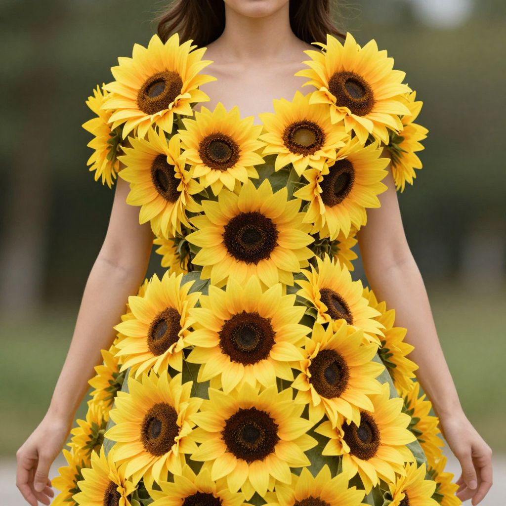Sunflower Costume, a close up of a woman wearing a dress made of sunflowers