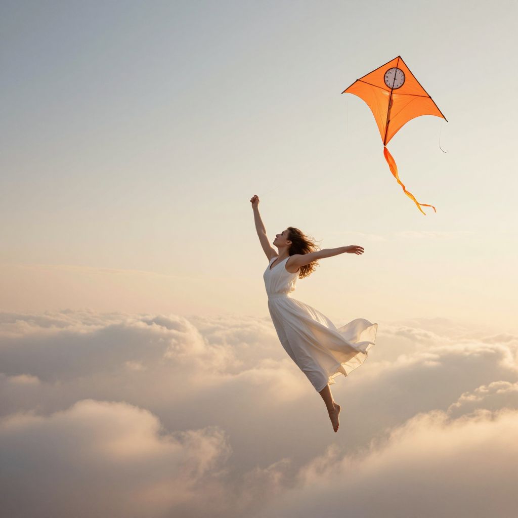 A whimsical digital artwork depicts a woman in a flowing white dress gracefully suspended in mid-air, her arms outstretched as she holds onto the string of a vibrant orange kite adorned with clock-like designs, evoking a dreamlike fusion of motion and time against a backdrop of ethereal clouds and golden-hour lighting.
