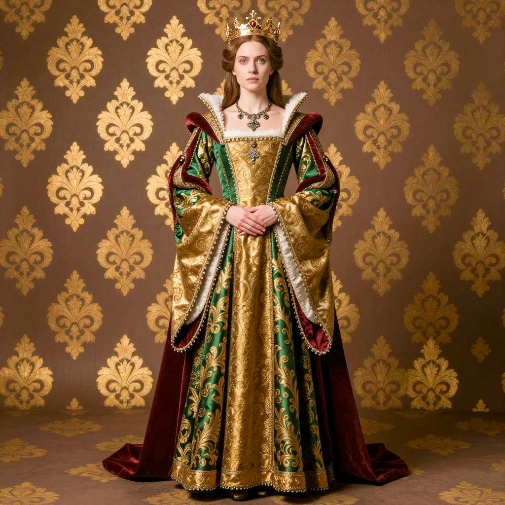 Woman king costume, photo of a queen, standing, front view, full body, realistic, medieval-style, golden crown, long brown hair, serious expression, wearing green and gold dress with intricate patterns, maroon and gold robe, hands clasped, ornate silver necklace, brown background with golden damask pattern, studio setting, portrait style, regal, elegant, historical, royal attire, detailed ures, Renaissance-inspired, centered composition