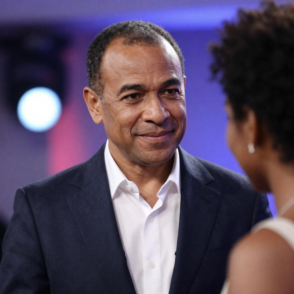 Photograph of a middle-aged man with short dark hair, wearing a dark patterned suit and white shirt, smiling slightly at a person with an afro, partially visible on the right. Background features colorful, blurred bokeh lights in blue, pink, and white. The man's face is illuminated, highlighting his features.