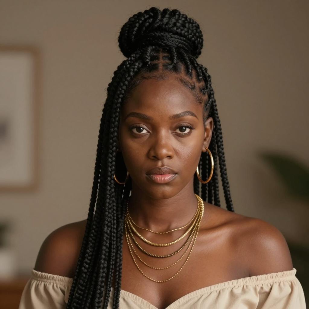 Braids african american, photograph of beautiful black woman with dark brown skin, long intricate box braids styled in a large updo, wearing multiple layered necklaces, gold hoop earrings, off-shoulder beige top, warm brown blurred background, soft natural light, serious expression, close-up, portrait, realistic style, high detail, elegant, traditional African hairstyles