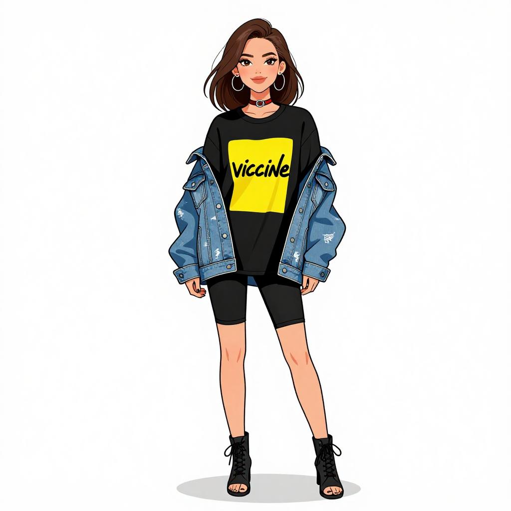 Woman with pretty face and pretty hair. smiling Woman, urban street style, oversized graphic t-shirt in black with bold yellow print, denim jacket draped over shoulders, distressed light wash, black choker with red detailing, black biker shorts, lace-up open-toe ankle boots, white background. --sref 1467