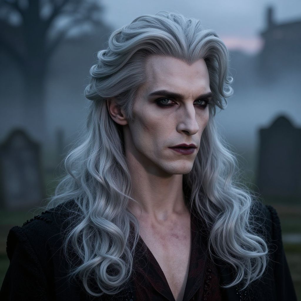 Male vampire hairstyles with long flowing silver hair, elegant curls, subtle blood stains on pale skin, Victorian gothic setting, mysterious fog, shadowy ancient cemetery backdrop, eerie twilight, ultra-realistic, detailed facial features.