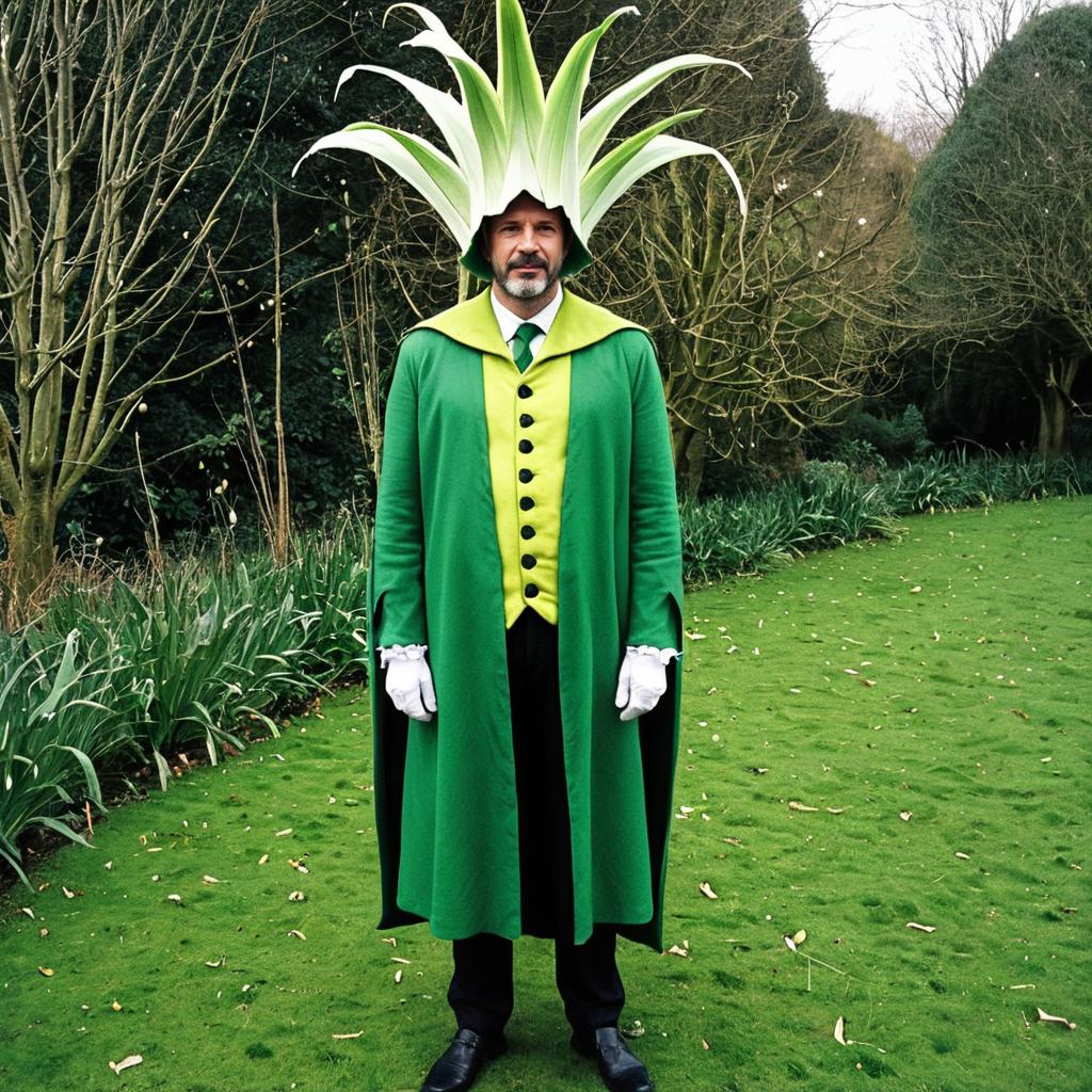Man in Leek Fancy Dress costume, full-body cosplay photo with themed props