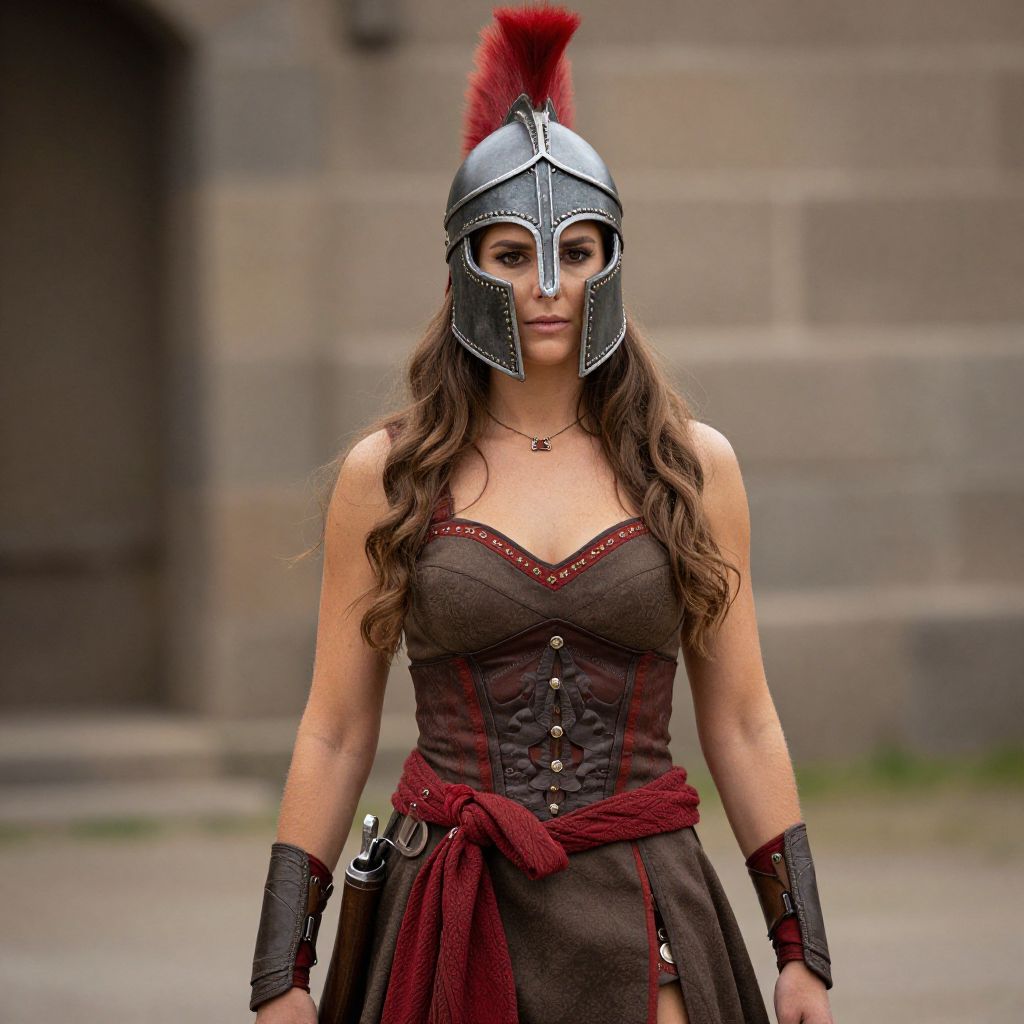 Woman with long brown hair, wearing a spartan helmet, and a brown and red dress with a scarf around her waist.