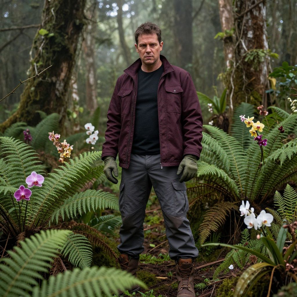 Photograph of a rugged-looking man standing in a lush, misty forest. He's wearing a dark maroon jacket, black shirt, gray cargo pants, green gloves, and brown boots. The forest is dense with ferns and colorful orchids, including pink, white, and yellow flowers. The man has short brown hair and a serious expression. The background is filled with tall trees and thick greenery.