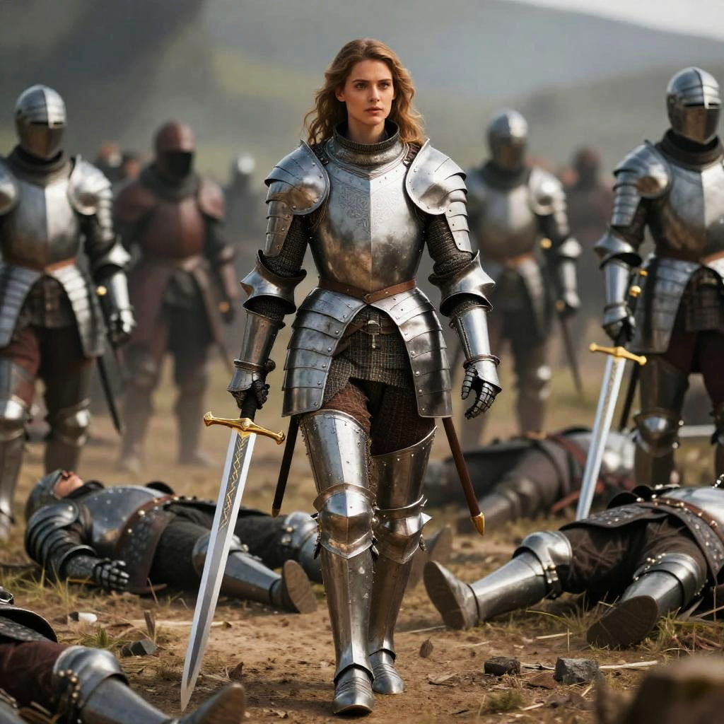 Photograph-style CGI of a determined woman in silver medieval armor, holding a sword, standing over fallen soldiers on a grassy battlefield.