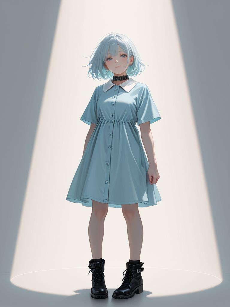 1girl, realistic face, full body shot, Woman, casual contemporary, denim skater dress in navy blue, sleeveless, V-neckline, flare skirt, knee-length, layered with a light beige long cardigan, relaxed fit, buttons down the front, ribbed cuffs, black slip-on sneakers, white soles, minimal jewelry with a thin bracelet, plain white studio background.