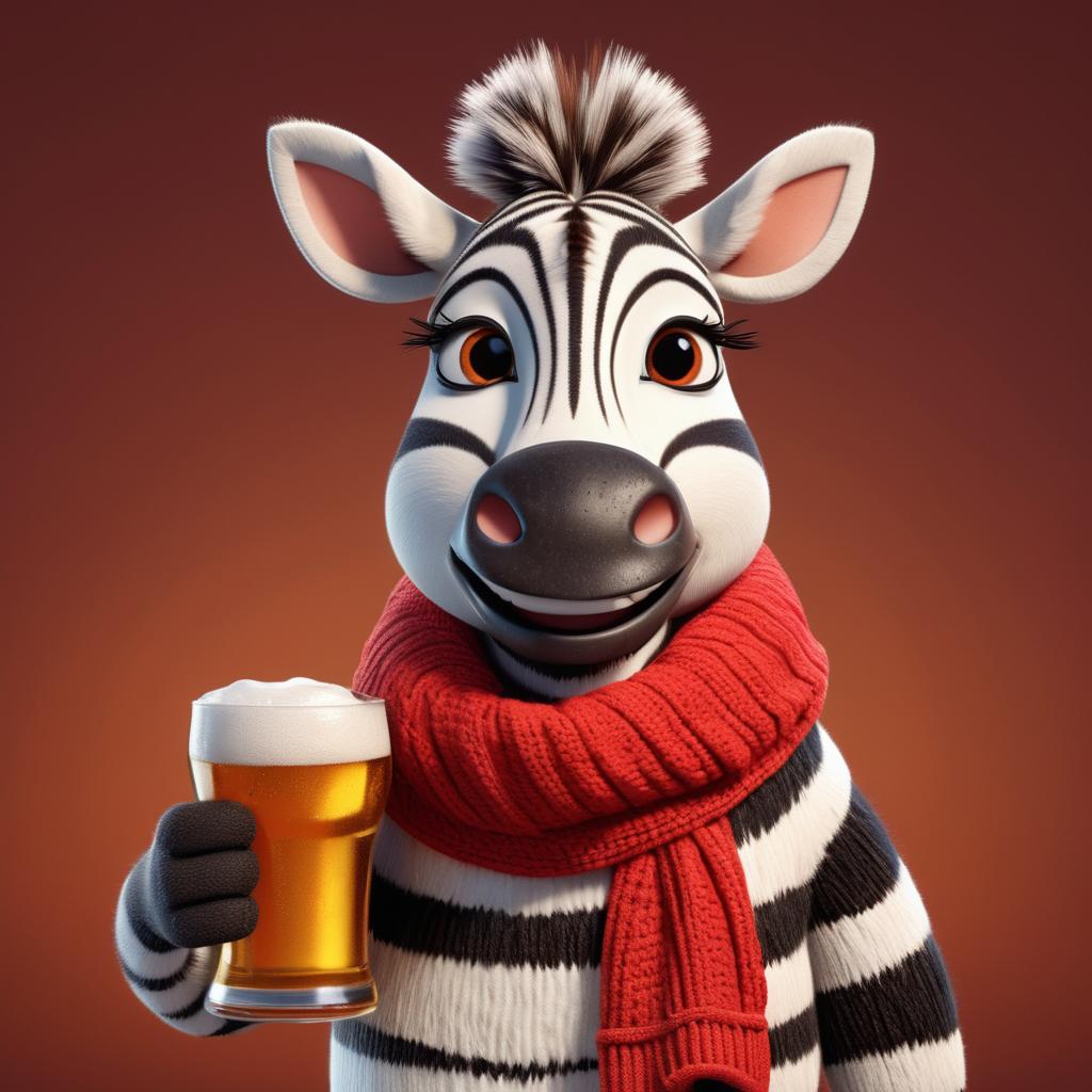 A 3d cartoon styled anthropomorphic zebra with expressive eyes and a playful smile, wearing a red knitted scarf, holding a frothy glass of beer, warm brown background, cozy atmosphere, detailed fur texture, character portrait