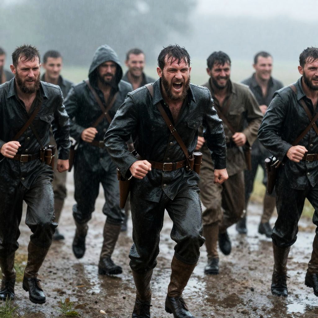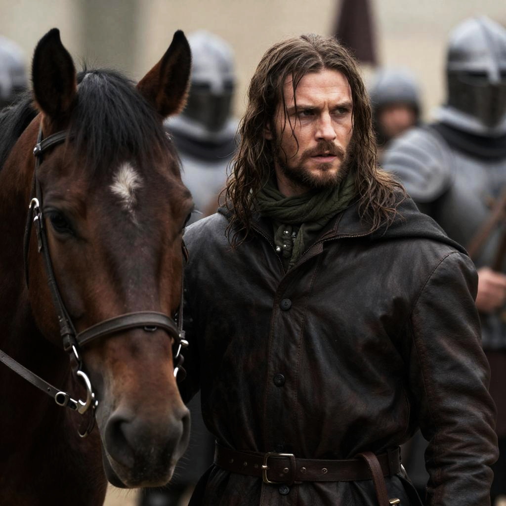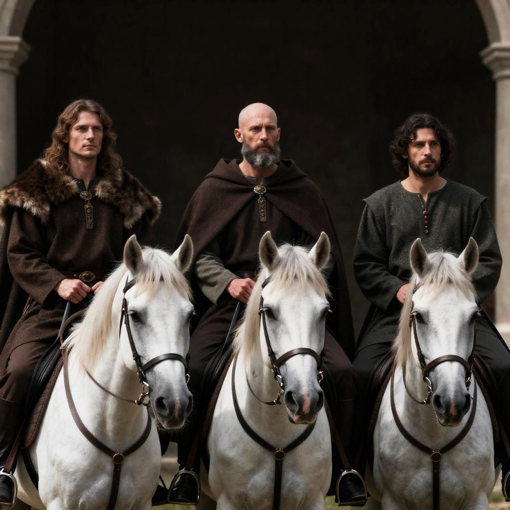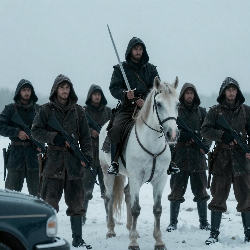 Photograph of six armed men in dark, tattered clothing standing in a snowy landscape. One man rides a white horse, holding a long sword. Blue-green light illuminates the scene. Men have intense, focused expressions. Snow covers the ground, and a car is partially visible in the foreground.