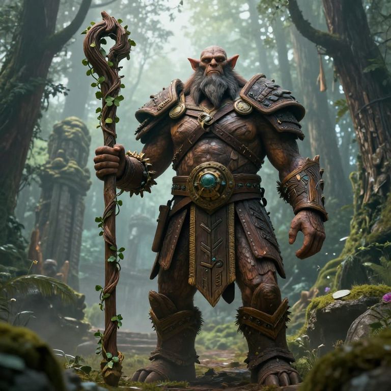 Digital art of a muscular, bearded orc warrior with pointed ears, holding a vine-wrapped staff, wearing detailed, bronze armor, standing in a
