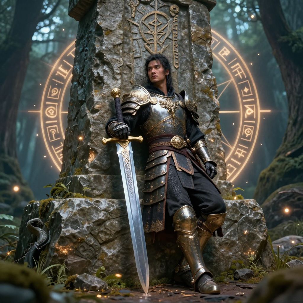 Leaning on sword, a fantasy warrior with ornate armor rests against a massive ancient sword embedded in stone, surrounded by mystical runes and glowing forest ambience