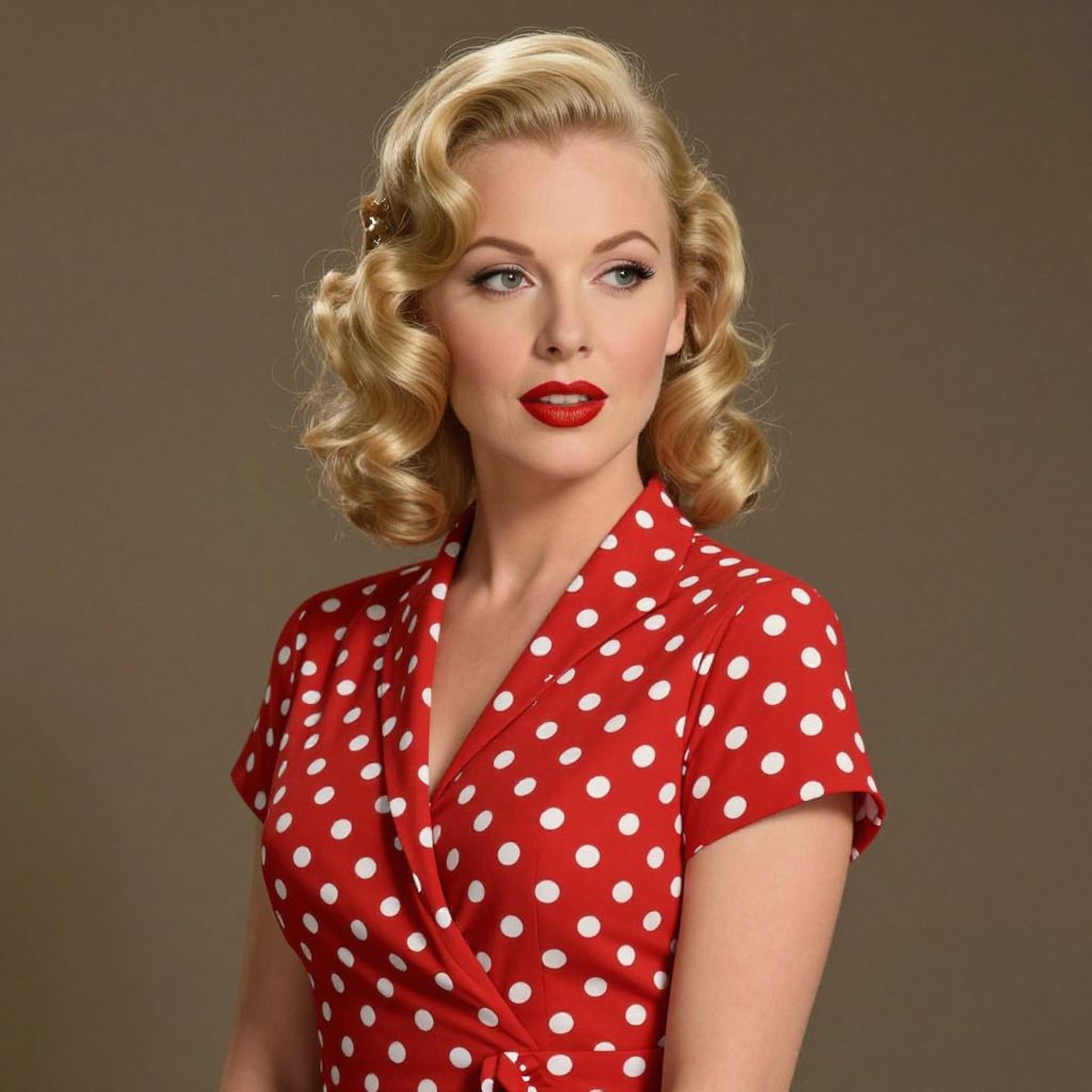 Elegant blonde woman with voluminous curls and bold red lipstick exudes classic allure in a vibrant red polka-dot dress, evoking the timeless glamour of the 1940s.