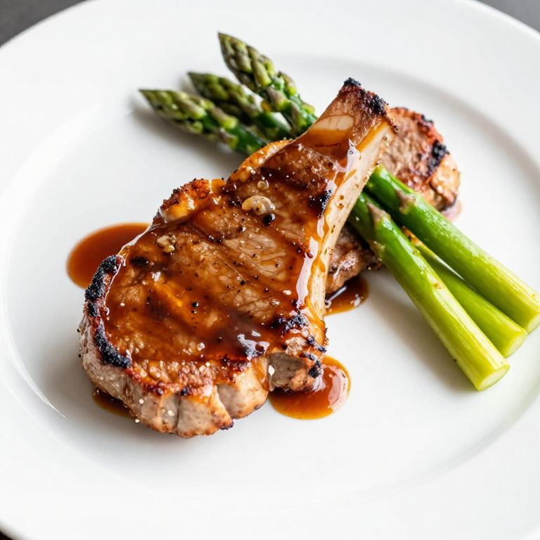 Grilled pork chops with a glossy brown sugar and cider vinegar gastrique are artfully presented on a white plate, accompanied by vibrant green asparagus spears drizzled with the same sauce, creating a harmonious balance of flavors and textures.