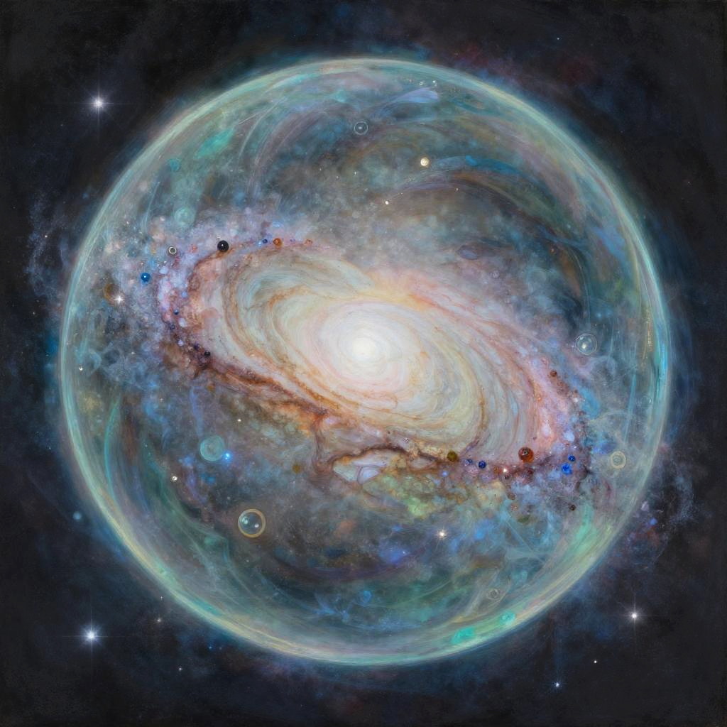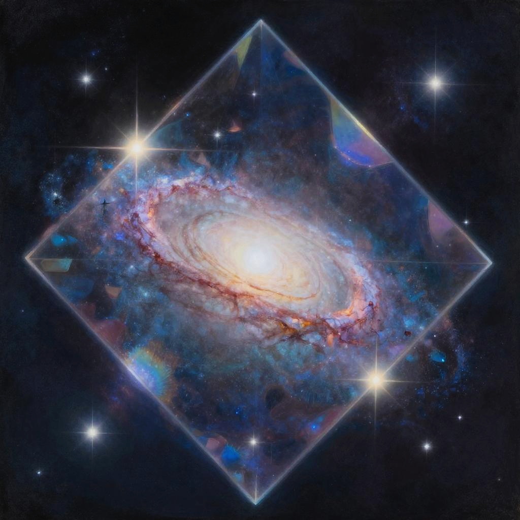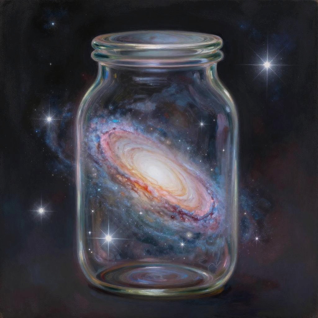 Fantasy painting by Maya Hollen of the Milky Way galaxy captured inside a magical prism, whimsical and surreal concept, high detail, soft colors, magical atmosphere