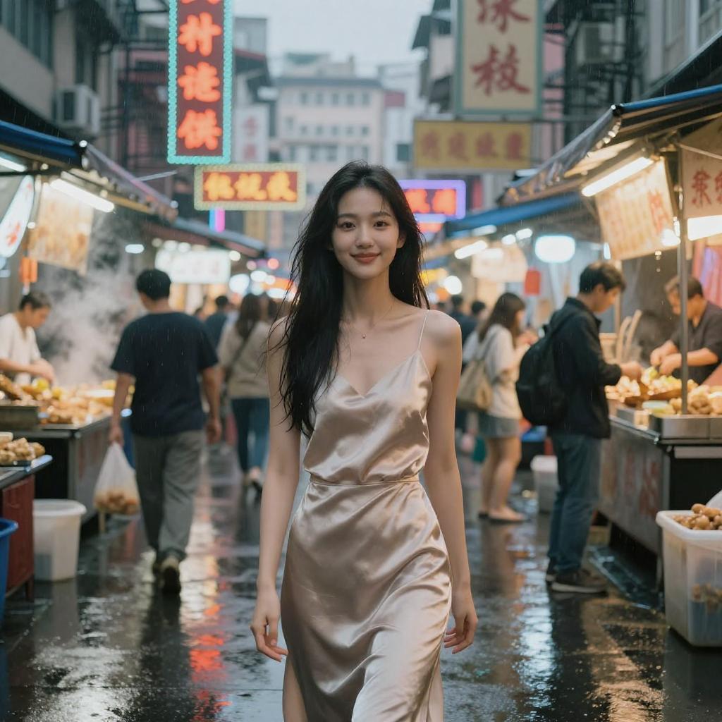 (8k, RAW photo, best quality, masterpiece:1.2), (realistic, photo-realistic:1.37), elegant young woman with long black hair in a flowing modern silk dress, cute:1.2, neon-lit Kowloon night market alley with colorful vendor stalls, hanging lanterns and dense Chinese signage, intimate crowded street, light drizzle, glossy wet pavement reflecting neon, steam rising from food stalls, warm and cool mixed lighting with gentle haze and visible rain droplets, professional lighting, rim light, photon mapping, radiosity, physically-based rendering, PBR, atmospheric perspective, front-facing, whole body, delicate face, soft smile, looking at viewer, five fingers, natural skin, minimal makeup, DSLR street photography, 35mm lens, shallow depth of field, film grain, high contrast, color graded, candid vibe, selfie pose