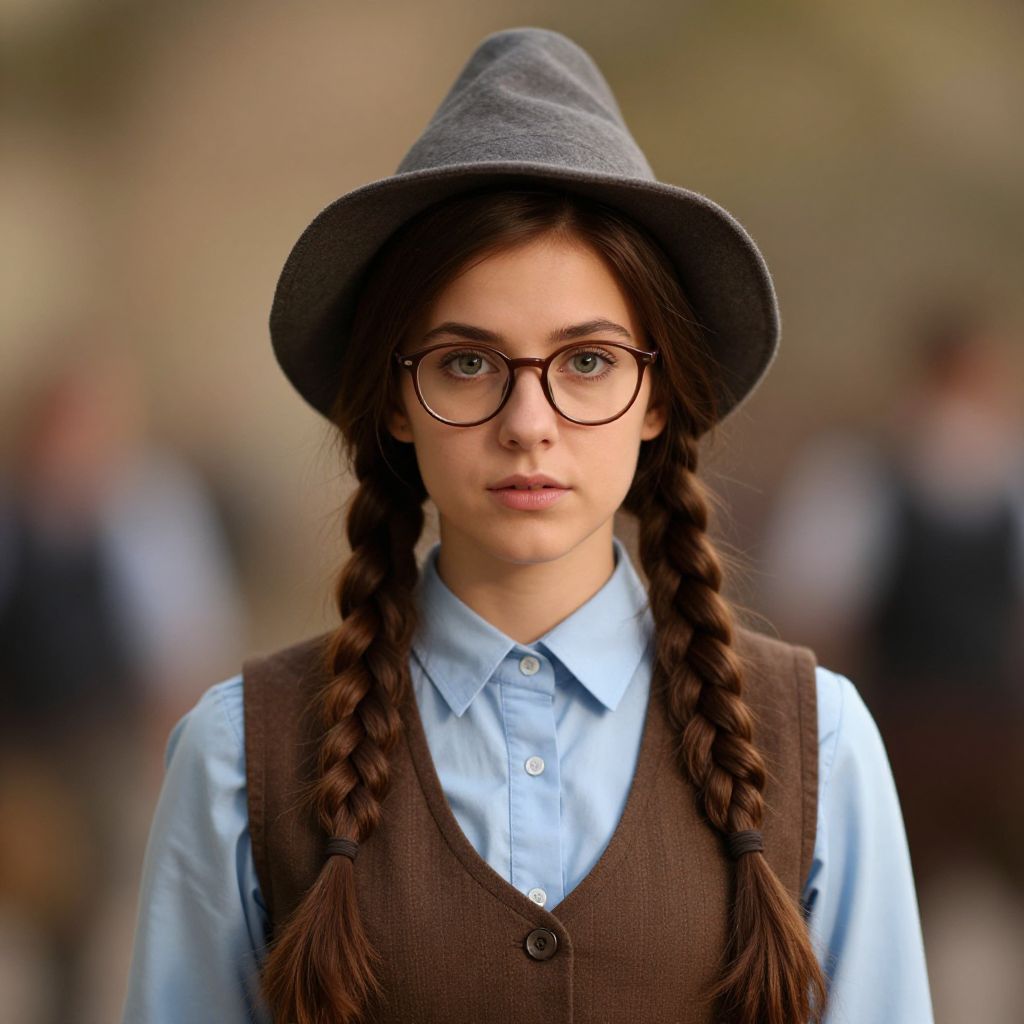Dorothy wizard costume, 1girl, solo, glasses, braid, twin braids, blurry background, looking at viewer, blurry, long hair, brown hair, lips, hat, realistic, shirt, green eyes, vest