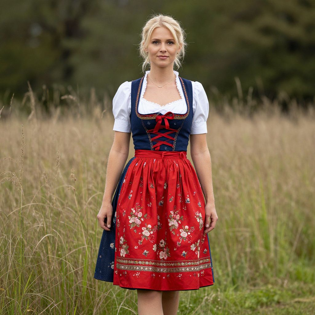 Blonde woman wearing a traditional Bavarian-style Midi Dirndl with a navy blue bodice, white puffed sleeves, and a vibrant red skirt adorned with floral patterns, standing gracefully in a serene countryside setting with tall grasses and trees in the background.
