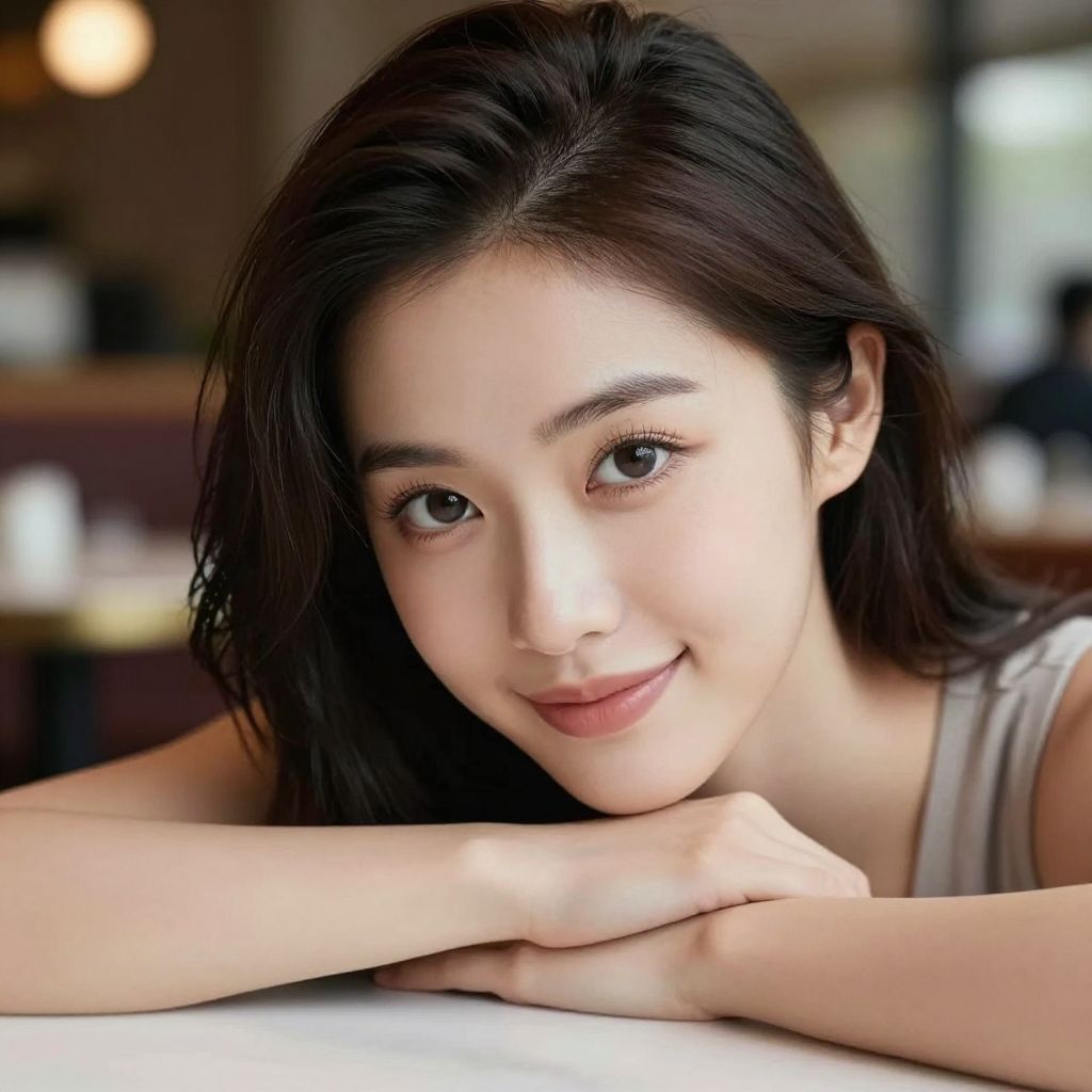 Photograph of an East Asian woman with fair skin and straight, dark brown hair. She has large, expressive brown eyes, thin eyebrows, and a gentle smile. She is leaning her head on her hands, which rest on a white surface. She is wearing a light gray, sleeveless top. The background is blurred, featuring warm, indoor lighting and a hint of a dark-colored wall and window. The focus is on her face, which is softly lit, highlighting her smooth skin and natural beauty. The overall mood is relaxed and approachable.