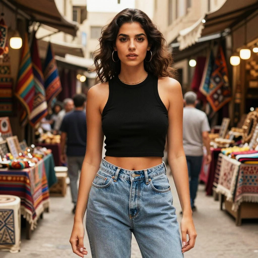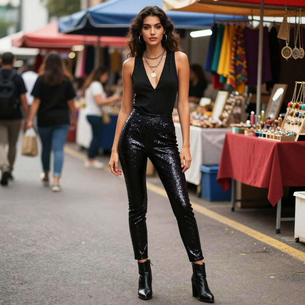 A slim woman in a rock chic style, wearing a sleeveless black top with a deep v-neck and sequined skinny pants, stands confidently in a vibrant street market, surrounded by colorful stalls. Her black ankle boots with a slight heel complement her tousled wavy hair, and layered chain necklaces with silver pendants add a touch of glam to the lively atmosphere. Sexy. Pretty face and beutiful eyes