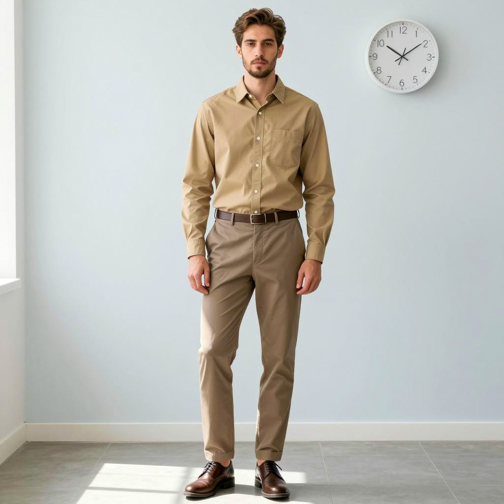 Light brown pant matching, photorealistic, full-body shot, handsome young man, standing in a bright room, wearing tan button-up shirt with chest pocket, brown pants with belt, brown shoes, short brown hair, trimmed beard, neutral expression, white clock on light blue wall in background, natural light from left side, modern minimalist setting, daytime, casual style, standing on gray tiled floor, slightly shadowed, realistic ures and details, fashion photograph, straight-on view, relaxed posture, contemporary clothing, subtle shadows, soft light.