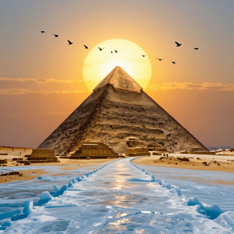 Photograph of the Great Pyramid of Giza at sunset, with a vivid, glowing orange sun directly behind the pyramid. The pyramid's dark, weathered stone contrasts with the bright sky. A path of icy blue water leads to the pyramid, with small waves and ice formations in the foreground. Black birds are flying in a V-formation above the sun. The background includes scattered stones and ancient structures around the base of the pyramid. The overall scene combines natural and surreal elements, with the icy water adding an unexpected twist to the ancient Egyptian landscape.