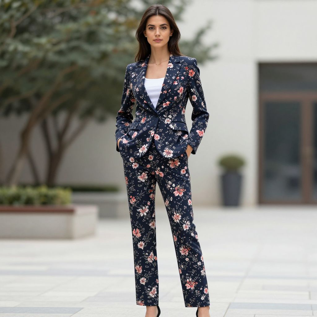 Long straight suit design, solo, flower, suit, hands in pockets, formal, 1girl, outdoors, realistic, pants, blurry, standing, brown hair, blurry background, looking at viewer, long hair