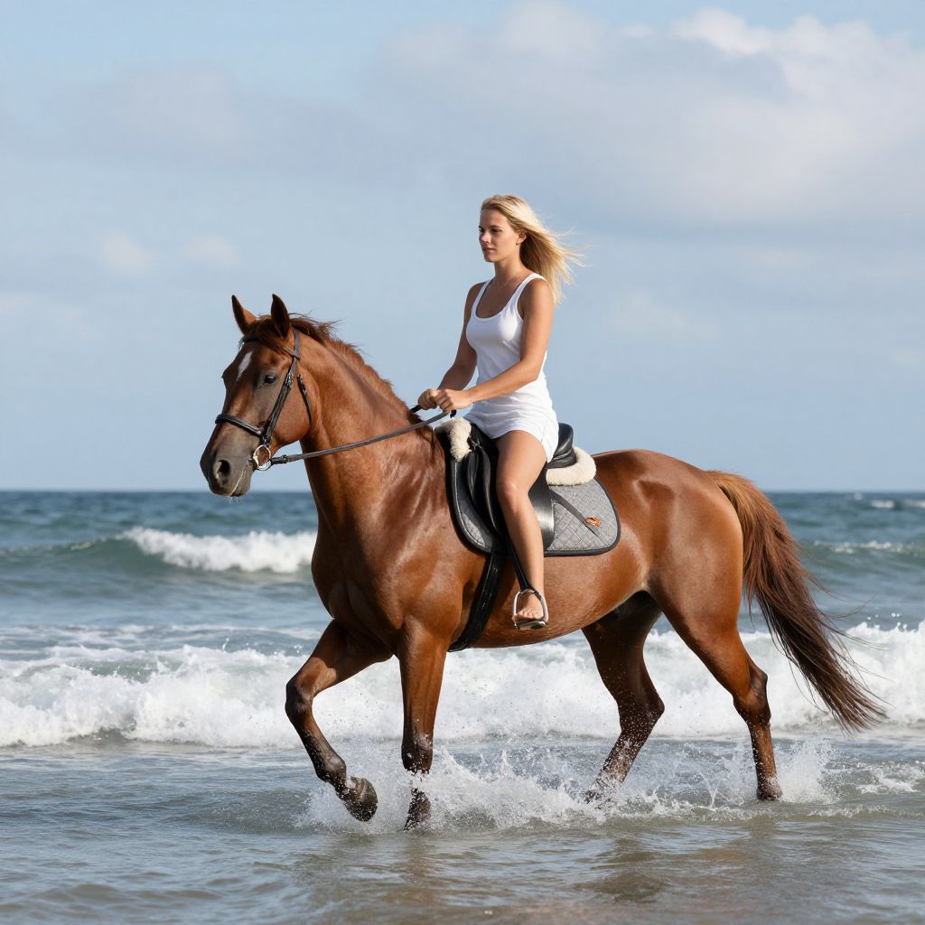 Photograph of a blonde woman with fair skin riding a brown horse along a beach. She wears a white tank top and black riding boots, with her hair blowing in the wind. The horse, with a shiny coat and black saddle, splashes through shallow waves. The ocean is visible in the background, with white-capped waves and a partly cloudy blue sky. The woman's focused expression and the horse's steady pace convey a sense of movement and connection. The image captures the dynamic interaction between the rider and horse in a natural, beachside setting.