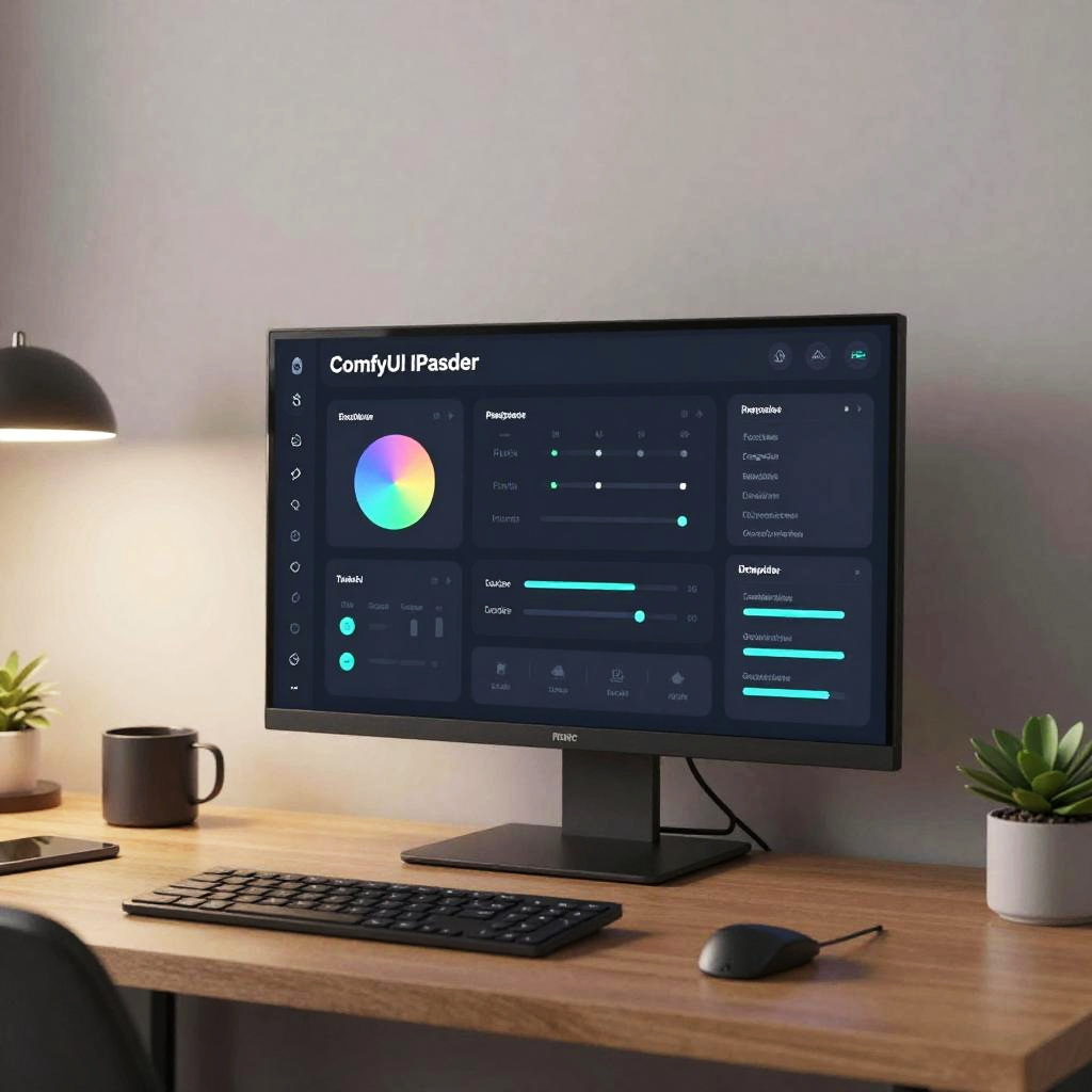 ComfyUI IPAdapter control panel with interactive controls, touchscreens and sliders, embedded in a modern workspace with ambient lighting, clean and minimalistic design, showcasing futuristic user interface technology.