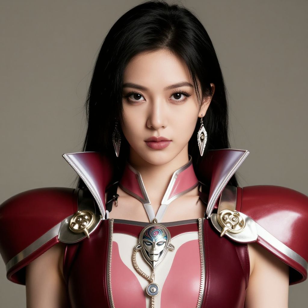 Photorealistic digital portrait of an East Asian woman with fair skin and long black hair. She wears a futuristic, maroon leather armor with metallic silver shoulder plates and a high collar. A silver pendant featuring a face motif hangs from her chest. Her expression is neutral, with slightly parted lips and almond-shaped eyes. She has small, silver, teardrop-shaped earrings. The background is a plain, gradient gray, drawing focus to her detailed attire and serene face. The image has a polished, high-detail CGI style.