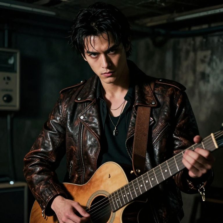 A bad boy prompt featuring a rugged, charismatic male in a dimly lit basement, wearing a leather jacket and holding a vintage guitar, eyes intense with mystery, deep shadows, cinematic lighting, dramatic atmosphere, noir style.