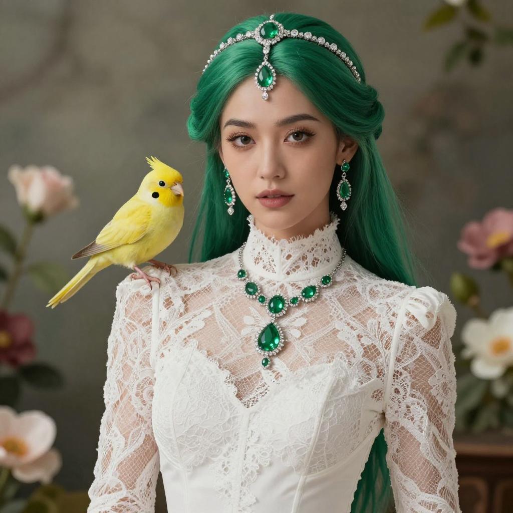 Digital portrait of a woman with long emerald green hair styled elegantly, adorned with matching emerald gemstone jewelry including a headpiece, earrings, and a necklace. She is wearing a high-collared white lace bodysuit with intricate patterns. A small yellow bird is perched on her shoulder. The background features soft-focus floral elements, blending realism with fantasy.
