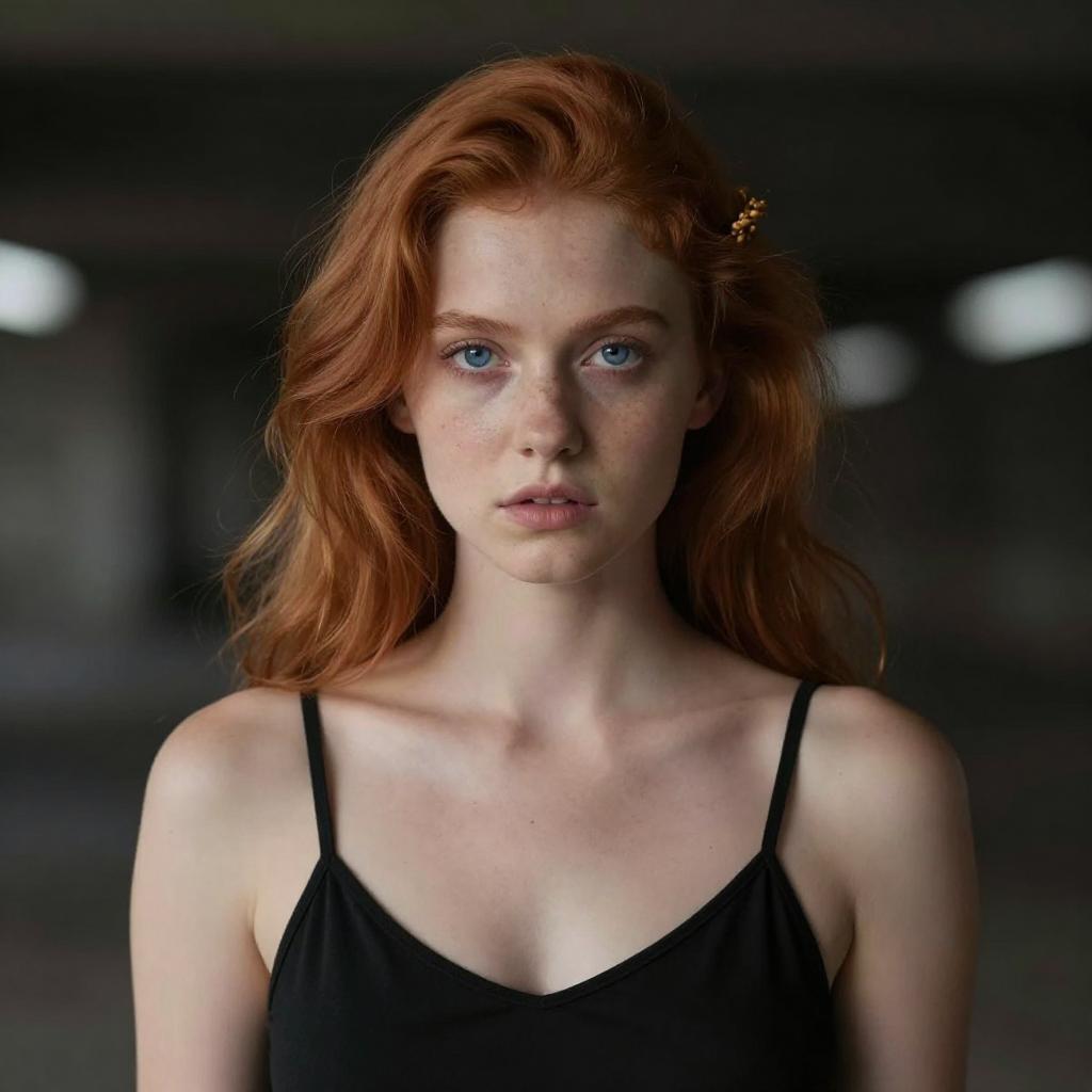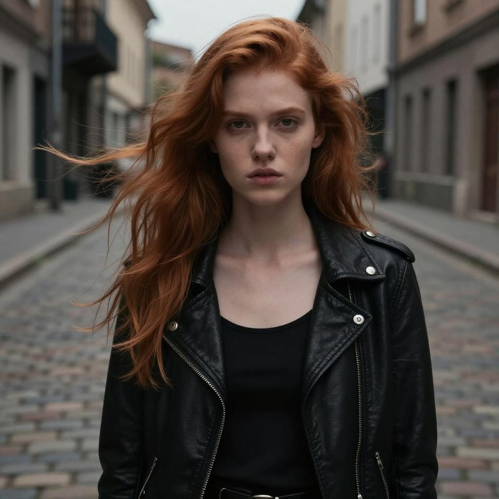 Photograph of a young woman with long, wild red hair blowing in the wind. She has a serious, intense expression with dark eyes and pale skin. She's wearing a black leather jacket over a simple black top. The background is a blurred, dark, urban street with cobblestones, giving a moody, dramatic feel to the image. The overall color palette is dark and muted.