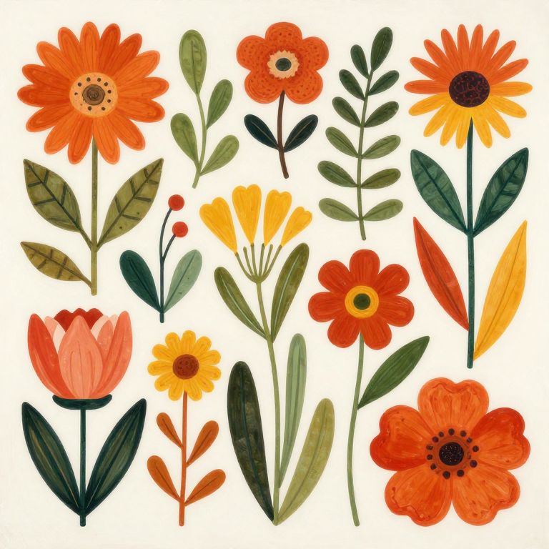 The image is a vibrant and intricate painting of flowers and plants, rendered in a minimalist style with a white background. The artwork is inspired by Tim Biskup and features warm, earthy tones such as oranges, reds, yellows, and greens, evoking a boho aesthetic. The composition is dynamic, with various flowers and leaves arranged in a seemingly random yet harmonious manner. The flowers, including large, bold blooms and delicate blossoms, are depicted with a mix of realistic and abstract elements, creating a sense of depth and texture. The leaves vary in shape and size, some elongated and others more rounded, adding to the visual complexity. The overall arrangement of the plants and flowers creates a sense of balance and rhythm, with some elements appearing closer to the viewer and others receding into the background. The painting has a poster art feel, with its bold colors and simplified forms, reminiscent of 1950s art deco and Zulu-inspired designs.