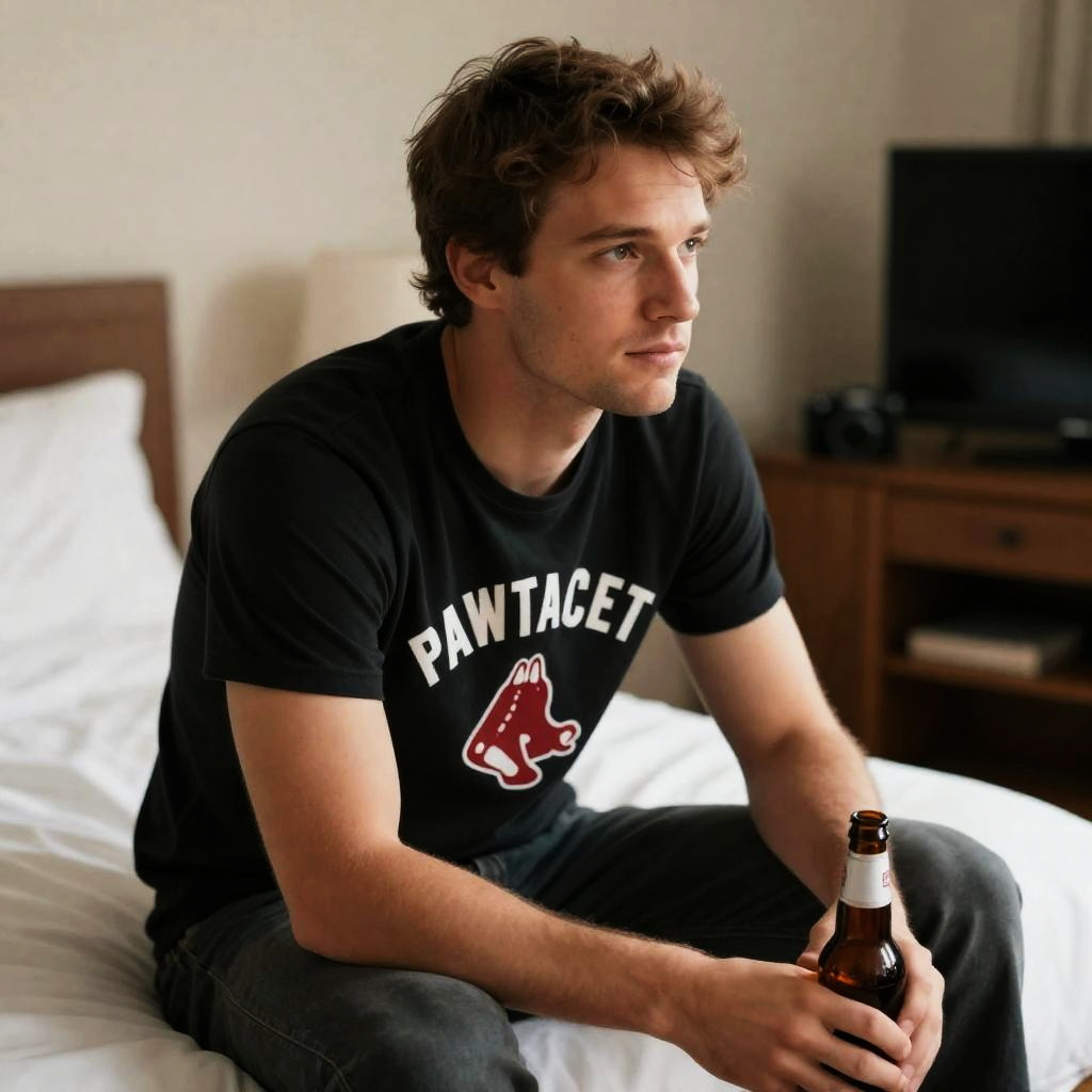 Photograph of a man with short brown hair and light skin, sitting on a bed, wearing a black "Pawtucket Red Sox" shirt, holding a beer bottle, looking to the right. Background includes a TV, camera, and wooden nightstand. Soft, warm lighting.