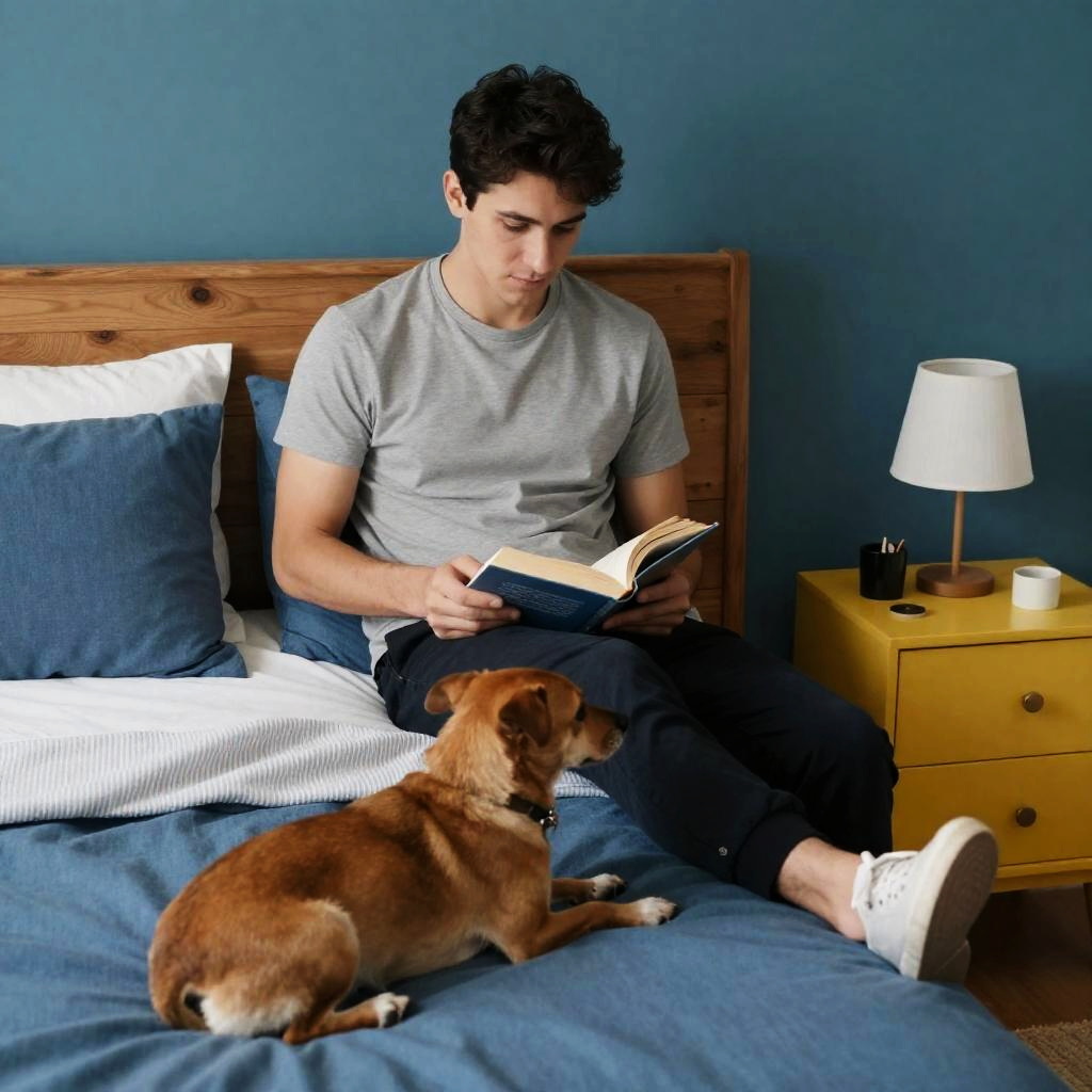 Woman with curly brown hair, medium build, red top, and white pants, lying on a bed with a dog. Blue fairy lights cover the ceiling and walls. White shuttered window in background. Desk with lamp, books, and pictures to the right. Dark room, cozy atmosphere.