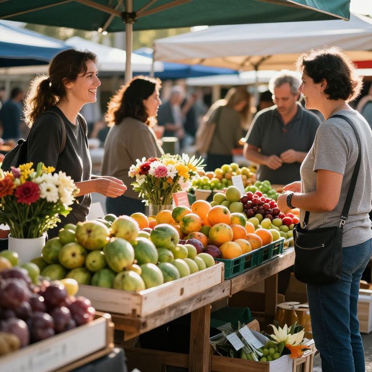 Joyous morning at a bustling farmers market, fresh fruits and flowers displayed on rustic wooden stalls, shoppers exchanging friendly smiles and animated conversations, warm sunlight casting soft shadows, rich textures and saturated colors depicting community and abundance.