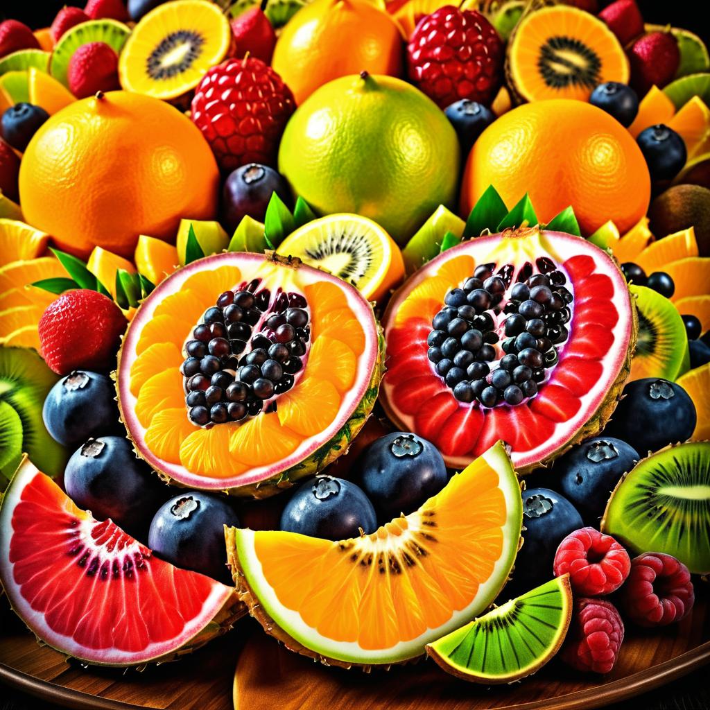 Macro gourmet photography of exotic fruit platter in HDR, professional quality with vibrant details.