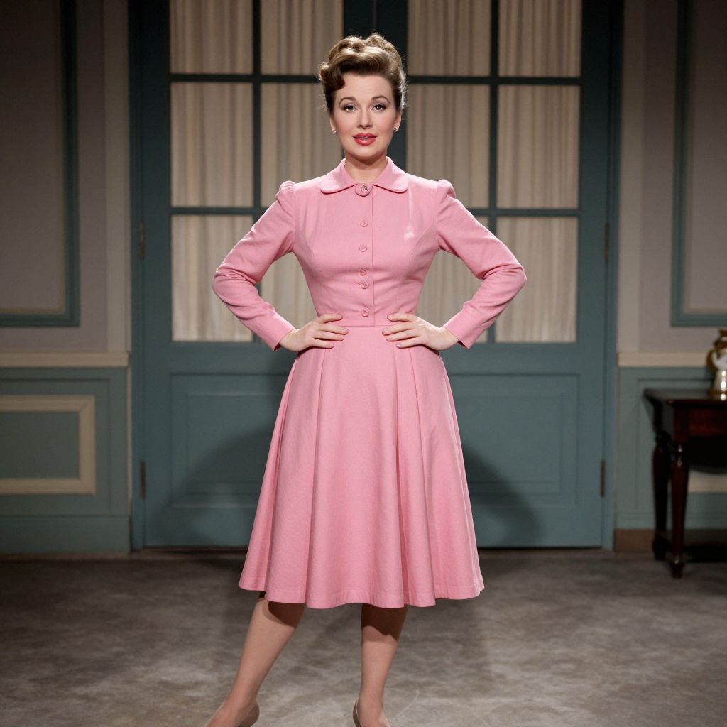 Love Lucy Costume Ethel, woman in a pink dress posing for a picture