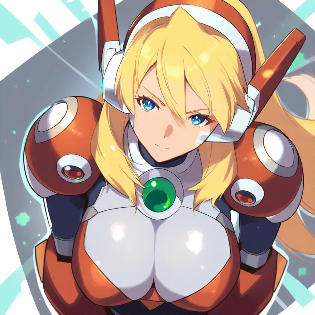 Alia (mega man), mega man (series), 1girl, robot ears, blue eyes, hair between eyes, blonde hair, long hair, large breasts, armor, armor, android, by artist akinaie, animagine
