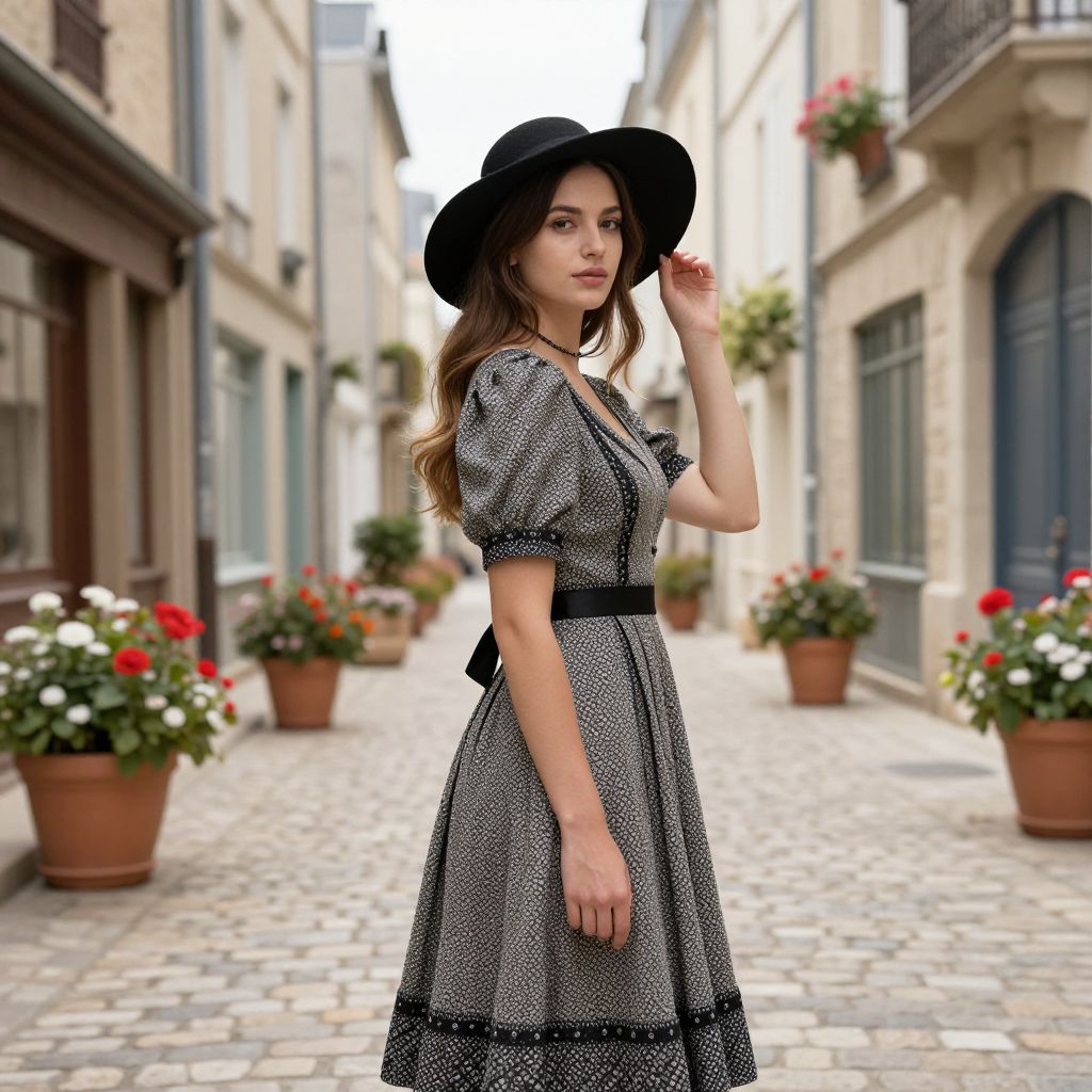 A beautiful woman in a black hat and vintage dress stands in a charming French street, surrounded by historic buildings and potted flowers.
