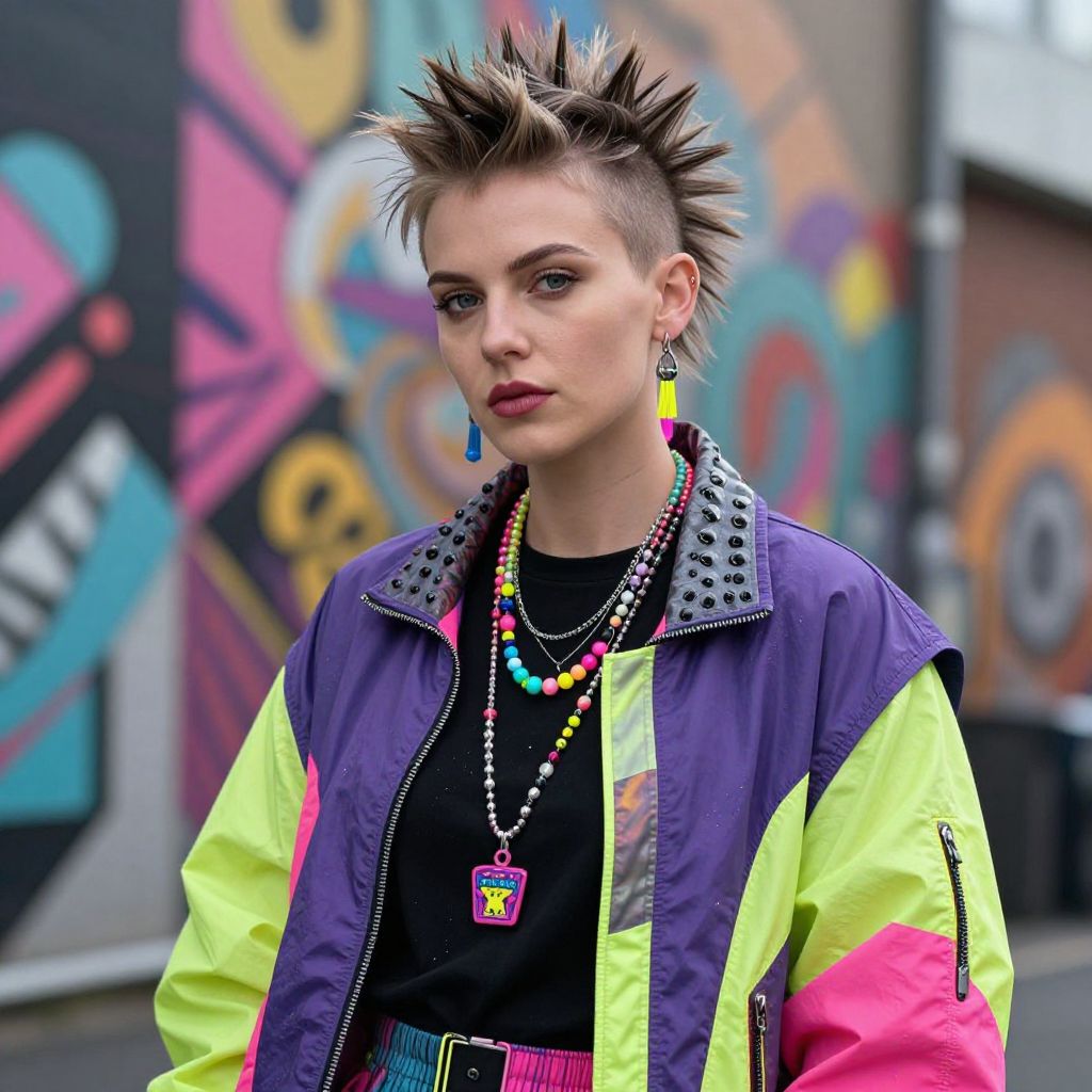 Caucasian woman with Faux Hawk hairstyle, gender-fluid and edgy fashion, bold unconventional style, modern streetwear, neon accessories, urban setting, confident expression, vibrant colors, dynamic lighting, contemporary art style, MidJourney v6.