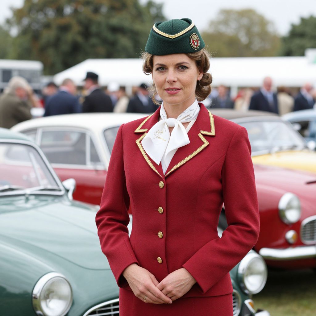 Woman wearing a vintage Goodwood Revival outfit, including a red blazer with gold trim, a white scarf, and a green cap adorned with an emblem, stands confidently in front of a row of classic cars at a motorsport event.