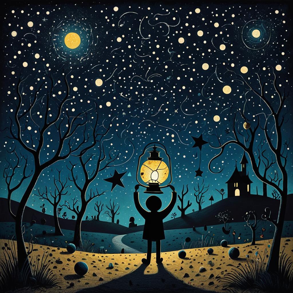Artwork inspired by Joan Miró style, illustrating an abstract figure holding a lantern, under a starlit night sky, surrounded by fantastical shapes, glowing orbs, whimsical creatures, with a mystical and playful ambiance