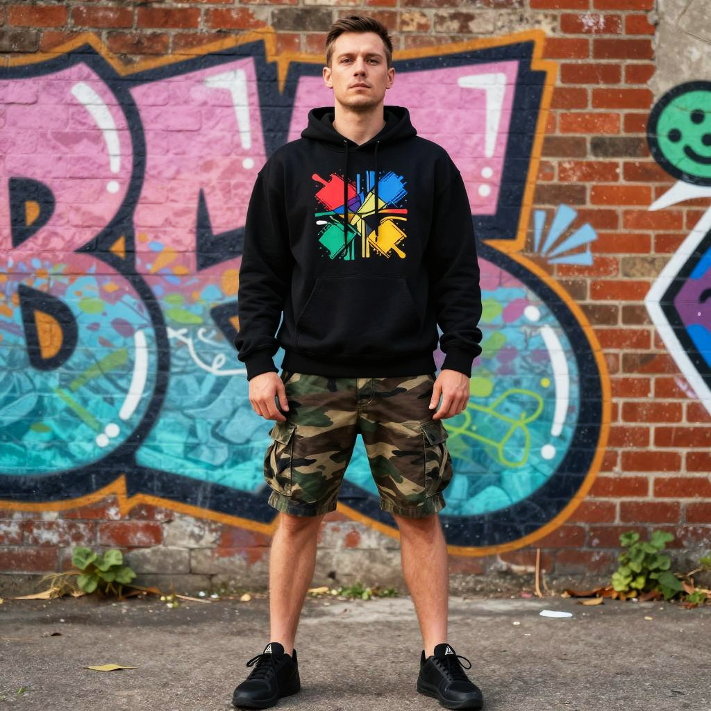An artistic image featuring a man standing confidently in front of a brick wall with colorful graffiti art. He is stylishly dressed in a hoodie with an abstract design, camo shorts, and black sneakers.