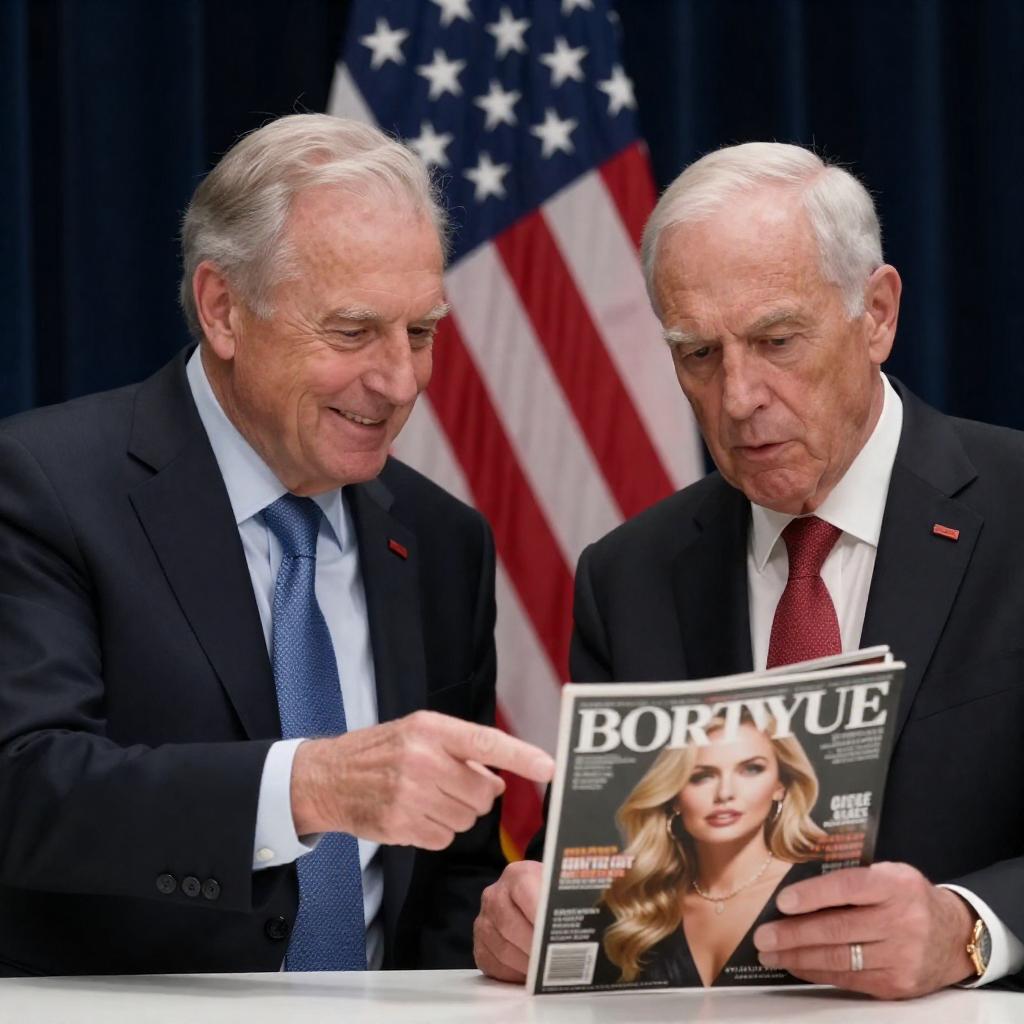 Photograph of two older men in formal suits seated at a table with a dark backdrop and an American flag in the background. One man with gray hair is smiling and pointing at a magazine held by the other man, who has a bald head and an intense expression. The magazine cover features a blonde woman and bold text.