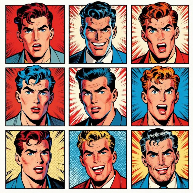 Comic-style collage of nine expressive, colorful headshots of a handsome, blue-eyed, dark-haired man with various emotions, vibrant backgrounds.